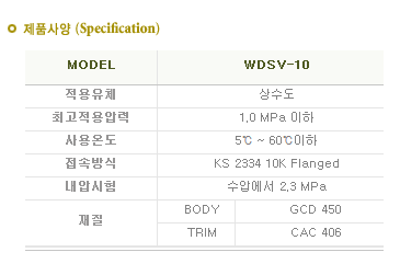 ● 밸브 동작부는 정밀가공에 의해 제작되어 개폐 동작이 유연합니다. ● 주요부품의 재질은 고강도의 구상흑연 주철제품(GCD450)을 사용하므로 인장강도, 충격 등에 강합니다.